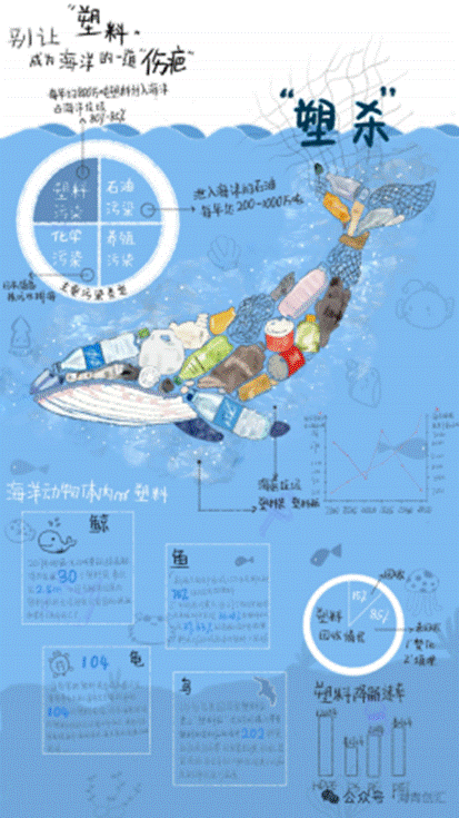 邹浩宏作品《“塑”杀——别让“塑料”成为海洋的一道“伤疤”》:以“拟人化塑料鱼”为视觉核心,通过扇形图 、折线图呈现“每年 800 万吨塑料入海”“鲸鱼体内30 个塑料袋 ”等数据, 搭配暗黑风格设计强化警示性, 兼具科学性与感染力。