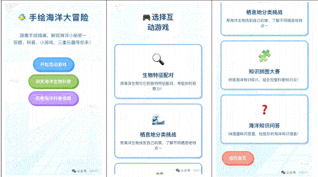 黄子钘《勇闯海洋大挑战——海洋科普》:以互动 H5 形式设计“游戏+知识+视频”模块, 包含 4 个科普小游戏 、15 种海洋生物知识卡 ,实现在互动中学习。